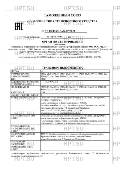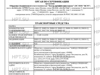 | Оборудование ТС | кондиционер (хладагент R-134a); устройство вызова экстренных оперативных служб по заказу: аппаратура спутниковой навигации; тахограф; для модификаций SM02-25, SM02-26: тент, задние распашные ворота насос с механическим приводом; для модификации SM18-05: счетчик жидкости; для модификации SM23-03: один проблесковый маяк оранжевого цвета; два проблесковых маяка оранжевого цвета |