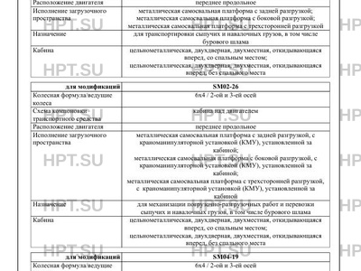 | Исполнение загрузочного пространства | металлическая самосвальная платформа с задней разгрузкой; металлическая самосвальная платформа с боковой разгрузкой; металлическая самосвальная платформа с трехсторонней разгрузкой металлическая самосвальная платформа с задней разгрузкой, с краноманипуляторной установкой (КМУ), установленной за кабиной; металлическая самосвальная платформа с боковой разгрузкой, с краноманипуляторной установкой (КМУ), установленной за кабиной; металлическая самосвальная платформа с трехсторонней разгрузкой, с краноманипуляторной установкой (КМУ), установленной за кабиной металлическая бортовая платформа, с краноманипуляторной установкой (КМУ), установленной за кабиной; металлическая бортовая платформа, с краноманипуляторной установкой (КМУ), установленной на заднем свесе металлическая бортовая платформа, с краноманипуляторной установкой (КМУ) (с рабочей платформой (люлькой)), установленной за кабиной; металлическая бортовая платформа, с краноманипуляторной установкой (КМУ) (с рабочей платформой (люлькой)), установленной на заднем свесе металлическая бортовая платформа сортиментовозная платформа с кониками, с устройством защиты кабины сортиментовозная платформа с кониками, с устройством защиты кабины, с краноманипуляторной установкой (КМУ), установленной за кабиной; сортиментовозная платформа с кониками, с устройством защиты кабины, с краноманипуляторной установкой (КМУ), установленной на заднем свесе; сортиментовозная платформа с кониками, с устройством защиты кабины, с гидроманипулятором (ГМ), установленным за кабиной; сортиментовозная платформа с кониками, с устройством защиты кабины, с гидроманипулятором (ГМ), установленным на заднем свесе металлический кузов; металлический кузов с самосвальной разгрузкой металлический кузов, с краноманипуляторной установкой (КМУ), установленной за кабиной; металлический кузов с самосвальной разгрузкой, с краноманипуляторной установкой (КМУ), установленной за кабиной; металлический кузов, с гидроманипулятором (ГМ), установленным за кабиной; металлический кузов с самосвальной разгрузкой, с гидроманипулятором (ГМ), установленным за кабиной цистерна круглого сечения цистерна эллиптического сечения; цистерна круглого сечения; цистерна чемоданообразного сечения погрузочно-разгрузочное оборудование крюкового типа; погрузочно-разгрузочное оборудование портального типа |