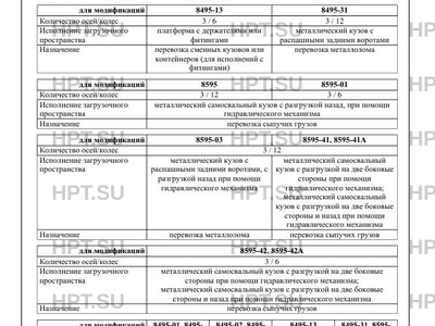 | Исполнение загрузочного пространства | бортовой кузов; бортовой кузов с каркасом для тента и тентом бортовой кузов; зов с каркасом для тента и тентом платформа с держателями или фитингами металлический кузов с распашными задними воротами металлический самосвальный кузов с разгрузкой назад, при помощи гидравлического механизма разгрузкой назад, при помощи гидравлического механизма металлический кузов с распашными задними воротами, с разгрузкой назад при помощи гидравлического механизма металлический самосвальный кузов с разгрузкой на две боковые стороны при помощи гидравлического механизма; металлический самосвальный кузов с разгрузкой на две боковые стороны и назад при помощи гидравлического механизма металлический самосвальный кузов с разгрузкой на две боковые стороны при помощи гидравлического механизма; металлический самосвальный кузов с разгрузкой на две боковые стороны и назад при помощи гидравлического механизма |