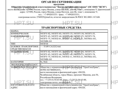 | Заявитель | Общество с ограниченной ответственностью "УралСпецТранс". место нахождения и фактический адрес: 456320, Челябинская область, город Миасс, проспект Макеева, дом 56, Российская Федерация. ОГРН: 1027400882431. Тел. +7 (3513) 54-63-00. Факс +7 (3513) 54-63-00. Email zavod@ust.ru. |