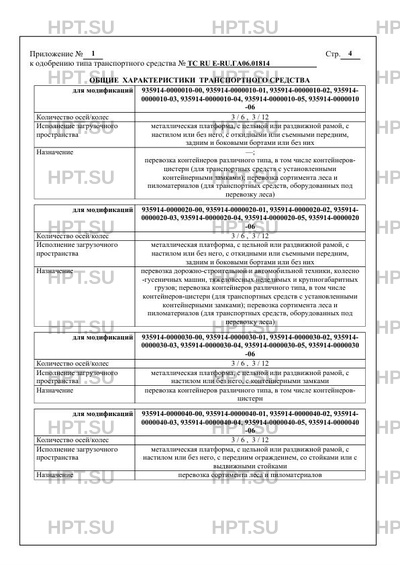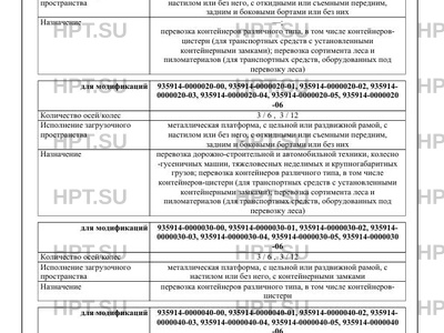 | Назначение | перевозка контейнеров различного типа, в том числе контейнеровцистерн (для транспортных средств с установленными контейнерными замками); перевозка сортимента леса и пиломатериалов (для транспортных средств, оборудованных под перевозку леса) перевозка дорожно-строительной и автомобильной техники, колесно -гусеничных машин, тяжеловесных неделимых и крупногабаритных грузов; перевозка контейнеров различного типа, в том числе контейнеров-цистерн (для транспортных средств с установленными контейнерными замками); перевозка сортимента леса и пиломатериалов (для транспортных средств, оборудованных под перевозку леса) перевозка контейнеров различного типа, в том числе контейнеровцистерн перевозка сортимента леса и пиломатериалов перевозка железобетонных панелей, плит и других изделий сборного домостроения |