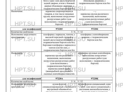 | Назначение | перевозка скоропортящихся товаров, в том числе пищевых грузов, выполнение погрузочноразгрузочных работ (для исполнения с гидравлическим бортом) -; перевозка грузов различного назначения, выполнение погрузочно-разгрузочных работ (для исполнения с гидравлическим бортом) перевозка грузов различного назначения, выполнение погрузочно-разгрузочных работ (для исполнения с гидравлическим бортом); перевозка живой рыбы (живорыбной продукции) в съемных контейнерах/емкостях перевозка грузовых контейнеров, выполнение погрузочноразгрузочных работ (для исполнения с гидравлическим бортом) перевозка кассет с баллонами (не соединенными коллектором), выполнение погрузочноразгрузочных работ (для исполнения с гидравлическим бортом) мобильный офис; сервисный центр; передвижной культурно-бытовой комплекс передвижной медицинский комплекс |