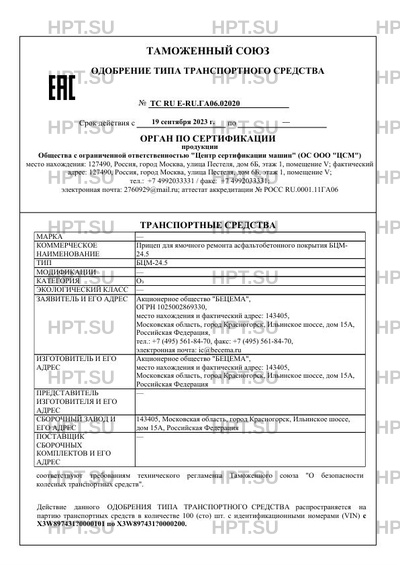 | Коммерческое наименование | Прицеп для ямочного ремонта асфальтобетонного покрытия БЦМ-24.5 |