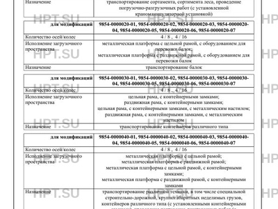 | Оборудование ТС | по заказу: одно запасное колесо; два запасных колеса; дополнительные опорные устройства; отбойные брусья; топливный бак; топливные баки; инструментальный ящик; противооткатные упоры; проблесковый маяк оранжевого цвета; механизм подъемаопускания 1-ой оси; механизм подъема-опускания 2-ой оси; механизм подъема-опускания 3-ей оси; механизм подъема-опускания 4-ой оси; подъемник запасного колеса; для 9854-0000010-0?: краноманипуляторная установка; для 9854-0000040-0?: металлический настил; деревянный настил; борта на гусачной части; борта на рабочей платформе; уширители; стойки; выдвижные стойки; краноманипуляторная установка; каркас тента и тент на рабочей площадке; каркас тента и тент на гусачной части; трапы с механическим приводом; трапы с гидравлическим приводом; трапы приставные; уголковые аппарели; для 9854-0000050-0?, 9854- 0000060-0?: металлический настил; деревянный настил; борта на гусачной части; борта на рабочей платформе; уширители; стойки; выдвижные стойки; краноманипуляторная установка; съемная ферма; каркас тента и тент на рабочей площадке; каркас тента и тент на гусачной части; трапы с механическим приводом; трапы с гидравлическим приводом; трапы приставные; уголковые аппарели; для 9854-0000070-0?: металлический настил; деревянный настил; стойки; выдвижные стойки; краноманипуляторная установка; надставные борта; тент; каркас тента и тент; для 9854-0000020-0?, 9854-0000080-0?: трапы с механическим приводом; трапы с гидравлическим приводом; трапы приставные; для 9854-0000080-0?: уширители; борта на гусачной части; для 9854-0000090-0?: задние распашные ворота; тент |