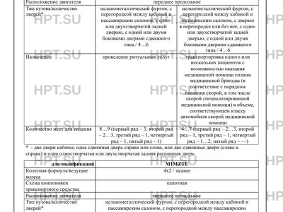 | Оборудование ТС | устройство вызова экстренных оперативных служб с автоматическим срабатыванием при опрокидывании; светосигнальная громкоговорящая установка (для M1MZSA, M1MZSB, M1MZSC) по заказу: кондиционер (хладагент R134A); электроблокировка замков дверей; тахограф; кондиционер накрышный; спутниковое навигационно-телематическое оборудование; подножка боковой и задних дверей; предпусковой подогреватель двигателя; совмещенная система вентиляции, отопления и кондиционирования (система управления климатом); догреватель охлаждающей жидкости; магнитола; круиз-контроль; центральный замок; система мониторинга транспорта ГЛОНАСС; дополнительный отопитель салона; теплоизоляция фургона; электропривод и обогрев наружных зеркал; электрические стеклоподъемники; система спутниковой навигации; антенна; мачта телескопическая; люк; аварийновентиляционный люк; специальные фонари наружного освещения; фара-искатель; наружные розетки; дополнительная аккумуляторная батарея (АКБ); радиостанция; система пожаротушения; дополнительные информационные надписи и опознавательные знаки; багажные полки; место для багажа; шкаф-гардероб; столы, в том числе откидные; тумбы; антресоли; раскладной стол; полки; мебель; рундук; стеллажи; раковина с подачей воды; кронштейны; сварные конструкции; разделительные решётки; выдвижные платформы; противоугонное устройство; шторки на окнах; тонировка стекол; выдвижная лестница или выносной трап; вводнораспределительное устройство (электрощит); сиденья используемые во время стоянки; системы сигнализации; электропривод подножек; электропривод боковой сдвижной двери; звуковой сигнал при движении задним ходом; таль грузоподъёмная; рейки и кольца такелажные; устройство, препятствующее началу движения при открытых/не полностью закрытых служебных дверях; крепление для гроба; багажник на крыше; лестница на задней двери; бортовое навигационно-связное оборудование; рундук по правому борту с возможностью размещения на нём вторых носилок для 1 больного; приёмное устройство для фиксации тележки-каталки с носилками; полное остекление |