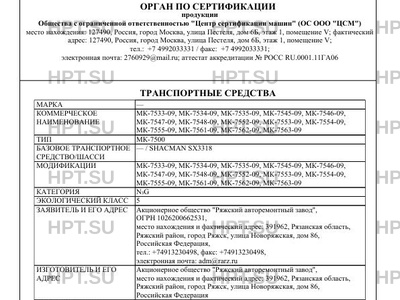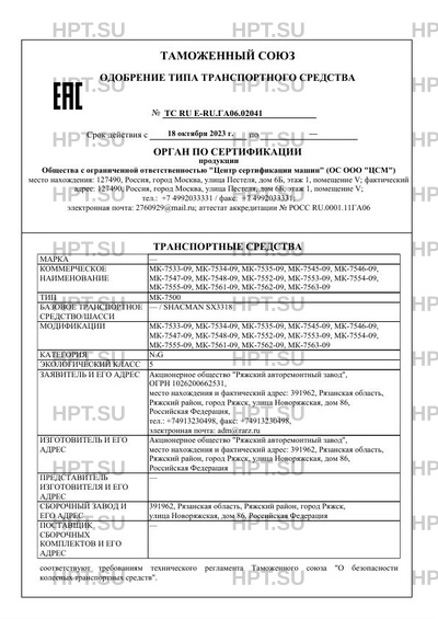 Предприятие-изготовитель Акционерное общество "Ряжский авторемонтный завод", место нахождения и фактический адрес: 391962, Рязанская область, Ряжский район, город Ряжск, улица Новоряжская, дом 86, Российская Федерация