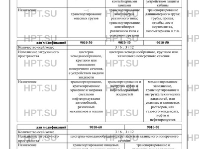 | Оборудование ТС | противооткатные упоры; запасное колесо; устройства увязки; бесшовные кабелепроводы защиты электропроводки, огнетушители, заземляющая цепочка и металлический штырь для защиты от статических и атмосферных электрических зарядов (для 9010-30, 9010-40, 9010-50, 9010-60, 9010-70 в исполнении для перевозки опасных грузов) по заказу: измерительное устройство топливораздачи (для 9010-30); откидные боковые и задние борта (для 9010-10); съемные боковые и задние борта (для 9010-10); выдвижные стойки или уширители (для 9010-10); каркас тента и тент (для 9010-10); отбойные брусья; дополнительное опорное устройство; подъемник запасного колеса; вакуумный насос, напорно-всасывающие рукава (для 9010-30, 9010- 40, 9010-50, 9010-60, 9010-70); гидропривод подъема/опускания цистерны (для 9010-50); гидравлический привод открывания/закрывания заднего днища цистерны (для 9010-50); механический привод открывания/закрывания заднего днища цистерны (для 9010-50); первая подъемная ось; третья подъемная ось |