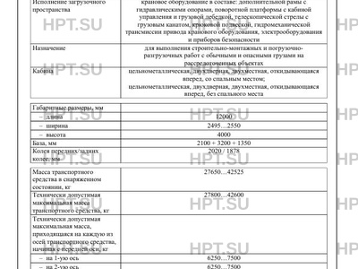 | Исполнение загрузочного пространства | крановое оборудование в составе: дополнительной рамы с гидравлическими опорами, поворотной платформы с кабиной управления и грузовой лебедкой, телескопической стрелы с грузовым канатом, крюковой подвеской, гидромеханической трансмиссии привода кранового оборудования, электрооборудования и приборов безопасности |