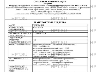 | Заявитель | Акционерное общество "Галичский автокрановый завод", ОГРН 1024401432450, место нахождения и фактический адрес: 157202, Костромская область, Галичский район, город Галич, улица Гладышева, дом 27, Российская Федерация, тел.: +7 (49437) 4-23-43, факс: +7 (49437) 4-23-43, электронная почта: info@gakz.ru |