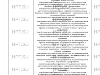 | Оборудование ТС | противооткатные упоры по заказу: гидравлический или ручной механизм подъема и опускания трапов или аппарели; приставные трапы; упоры от смещения груза; борта; тент; лебедки; стойки; силовая гидравлическая установка; раздвижной стол; опорные устройства; инструментальные ящики; запасные колеса; проблесковые маячки; механизм подъема-опускания первой или первой и второй или первой и четвертой или первой и второй и четвертой осей |