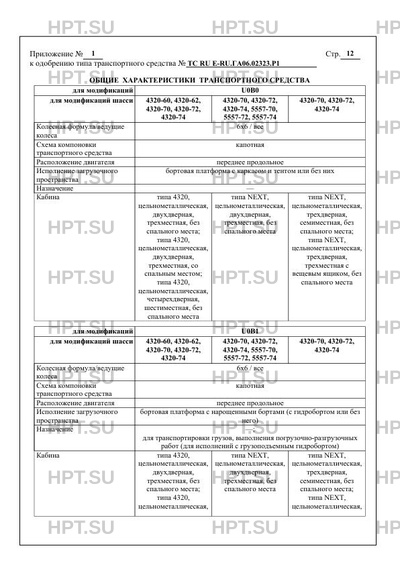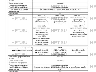| Оборудование ТС | централизованная система регулирования давления воздуха в шинах; устройство ограничения максимальной скорости (функцию устройства ограничения максимальной скорости выполняет электронный блок управления двигателем); устройство вызова экстренных оперативных служб с автоматическим срабатыванием при опрокидывании; дневные ходовые огни (для модификаций с кабиной типа NEXT) по заказу: предпусковой подогреватель двигателя; лебедка; лестницы; переговорные устройства; радиостанции; стеллажи; ящики; полки; столы; рундуки; климатические установки; отопители; оборудование для автономного энергоснабжения; оборудование мастерской; инструмент; верстаки; специальное оборудование (по назначению автомобиля и техническому заданию заказчика); каркас тента; гидровращатель; ручной гидравлический насос; рабочая платформа; держатель запасного колеса; передние противотуманные фары (для модификаций с кабиной типа 4320) |
