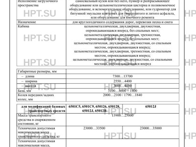 | Исполнение загрузочного пространства | самосвальный кузов или без него, бункер и разбрасывающее оборудование или цельнометаллическая цистерна и поливомоечное оборудование, и вспомогательное оборудование, или гудронатор для битумной эмульсии или котел для твердолитого и литого асфальта, или оборудование для ямочного ремонта |