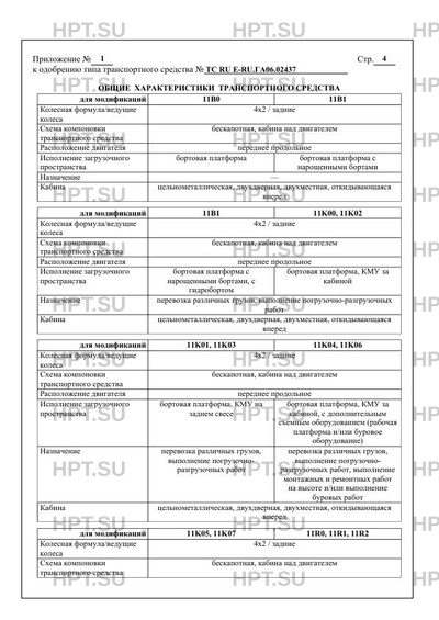 | Исполнение загрузочного пространства | бортовая платформа бортовая платформа с нарощенными бортами бортовая платформа с нарощенными бортами, с гидробортом бортовая платформа, КМУ за кабиной бортовая платформа, КМУ на заднем свесе бортовая платформа, КМУ за кабиной, с дополнительным съемным оборудованием (рабочая платформа и/или буровое оборудование) бортовая платформа, КМУ на заднем свесе, с дополнительным съемным оборудованием (рабочая платформа и/или буровое оборудование) подъемное оборудование в составе: рамы с гидравлическими опорами; опорно-поворотного устройства; секционной стрелы с рабочей платформой |