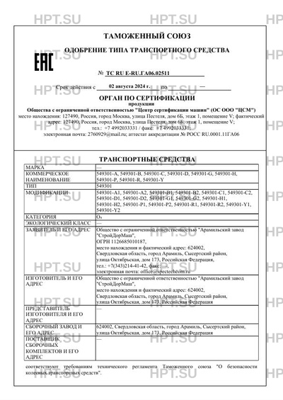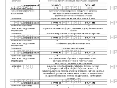 | Оборудование ТС | противооткатные упоры; запасное колесо; устройства увязки (для 549301-P1, 549301-P2, 549301-R1, 549301-R2); бесшовные кабелепроводы защиты электропроводки, заземляющая цепочка и металлический штырь для защиты от статических и атмосферных электрических разрядов, огнетушители (для 549301-А1, 549301-А2, 549301-В1, 549301-В2, 549301-С1, 549301-С2) по заказу: тент (для 549301-P1, 549301-P2); шторный механизм (для 549301-P1, 549301-P2); насос; открывающееся днище (для 549301- В1, 549301-В2, 549301-Н1, 549301-Н2); стойки (для 549301-P1, 549301-P2) |
