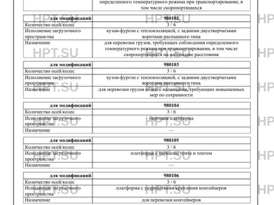 Оборудование ТС для 980101: холодильно-отопительная установка по заказу: механизм подъема/опускания первой оси; запасное колесо; противооткатные упоры; корзина на два запасных колеса; ящик инструментальный; ящик для палет; топливный бак; для 980105, 980107: задние двустворчатые ворота распашного типа