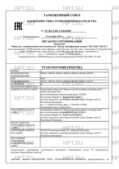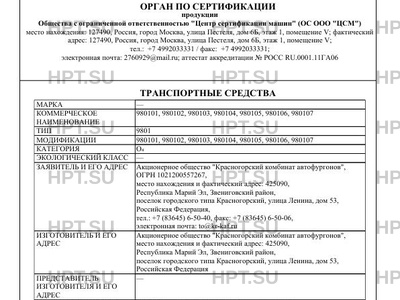 Заявитель Акционерное общество "Красногорский комбинат автофургонов", ОГРН 1021200557267, место нахождения и фактический адрес: 425090, Республика Марий Эл, Звениговский район, поселок городского типа Красногорский, улица Ленина, дом 53, Российская Федерация, тел.: +7 (83645) 6-50-40, факс: +7 (83645) 6-50-06, электронная почта: to@kr-kaf.ru