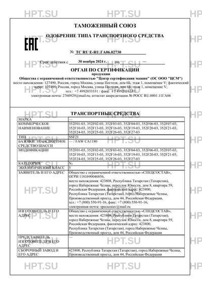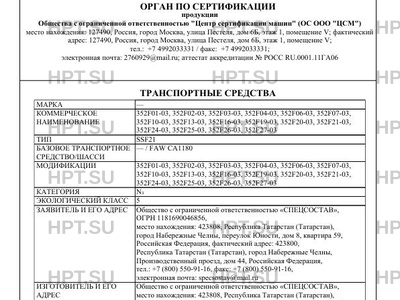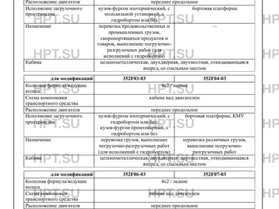 | Оборудование ТС | кондиционер; устройство вызова экстренных оперативных служб; два проблесковых маячка автожелтого цвета, бесшовные кабелепроводы защиты электропроводки, заземляющая цепочка и металлический штырь для защиты от статических и атмосферных электрических разрядов, искрогасительная сетка и теплозащитный экран на выпускной трубе глушителя; защита топливных баков и аккумуляторных батарей, огнетушители, устройство ограничения максимальной скорости (для 352F19-03, 352F27-03); один, два или три проблесковых маяка автожелтого цвета (для 352F20-03, 352F21- 03, 352F24-03) по заказу: тахограф; тент; каркас с тентом; задние распашные ворота; сменное навесное уборочное оборудование (для 352F20-03); инструментальный ящик; гидравлический привод открывания/закрывания заднего днища цистерны (для 352F19-03, 352F24-03); гидравлический привод подъема/опускания цистерны (для 352F19-03, 352F24-03); поворотная консоль (для 352F19-03, 352F24-03); барабан для намотки рукавов (для 352F25-03); насос с гидравлическим приводом (для 352F25-03); насос с механическим приводом (для 352F25-03); лебедка в задней части (для 352F21-03); отопительная установка (для 352F01-03); дополнительные фонари заднего хода |