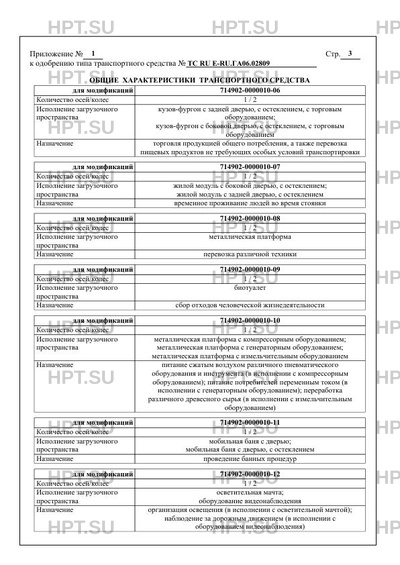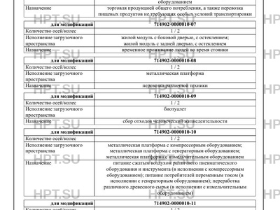 | Исполнение загрузочного пространства | кузов-фургон с задней дверью, с остеклением, с торговым оборудованием; кузов-фургон с боковой дверью, с остеклением, с торговым оборудованием жилой модуль с боковой дверью, с остеклением; жилой модуль с задней дверью, с остеклением металлическая платформа биотуалет металлическая платформа с компрессорным оборудованием; металлическая платформа с генераторным оборудованием; металлическая платформа с измельчительным оборудованием мобильная баня с дверью; мобильная баня с дверью, с остеклением осветительная мачта; оборудование видеонаблюдения кузов-фургон с задней и боковой дверью; кузов-фургон с задней и боковой дверью, с остеклением платформа для перевозки кабеля металлическая ферма оборудование для ремонта и обслуживания дорог кузов-фургон с задней двустворчатой дверью, с рефрижераторной установкой |