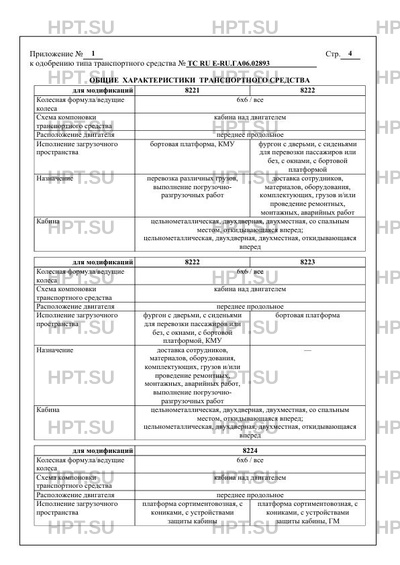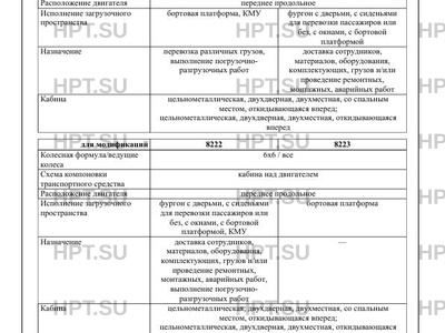 Оборудование ТС устройство вызова экстренных оперативных служб с ручным включением и автоматическим срабатыванием при опрокидывании; устройство ограничения максимальной скорости; тахограф цифровой исполнения ADR; независимый жидкостный подогреватель; устройства освещения рабочей зоны; проблесковые маяки автожелтого цвета (для 8231, 8251, 8253, 8282); бесшовные кабелепроводы защиты электропроводки, заземляющая цепочка и металлический штырь для защиты от статических и атмосферных электрических разрядов, искрогасительная сетка и теплозащитный экран на выпускной трубе глушителя, защита топливных баков и аккумуляторных батарей, огнетушители, устройство ограничения максимальной скорости (для 8251, 8253, 8282); топливозаправочное оборудование и счетчик жидкости (для 8251) по заказу: кондиционер; электрический дверной замок; антенна; система телематики и диагностики "CS-BB"; автономный отопитель кабины; централизованная система автоматической подкачки и регулировки давления в шинах; тахограф; жидкостный подогреватель двигателя; сменное навесное оборудование: отвал комбинированный, отвал простой, отвал скоростной, отвал грейдерный, отвал боковой, щетка средняя, щетка передняя, щетка моющая, моющий агрегат (для 8231); тент; каркас и тент; холодильная и/или отопительная установка (для 8281); 1 пассажирское сидение в фургоне (для 8222, 8225); 2 пассажирских сидения в фургоне (для 8222, 8225); 3 пассажирских сидения в фургоне (для 8222, 8225); 4 пассажирских сидения в фургоне (для 8222, 8225); 5 пассажирских сидений в фургоне (для 8222, 8225); 6 пассажирских сидений в фургоне (для 8222, 8225)
