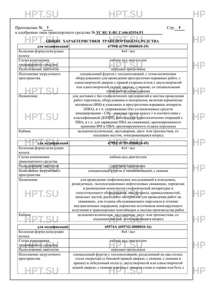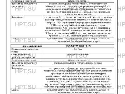 | Оборудование ТС | устройство ограничения максимальной скорости (функцию устройства ограничения максимальной скорости выполняет электронный блок управления двигателем); устройство вызова экстренных оперативных служб с функцией автоматического срабатывания при опрокидывании; один или два проблесковых маячка автожелтого цвета, бесшовные кабелепроводы защиты электропроводки, заземляющая цепочка и металлический штырь для защиты от статических и атмосферных электрических разрядов, искрогасительная сетка и теплозащитный экран на выпускной трубе глушителя, защита топливных баков и аккумуляторных батарей, огнетушители (для 6799B (6799-0000010-19)); защита от возгорания шин, система пожаротушения моторного отсека (для 6799B (6799- 0000010-19) в исполнении EX/III) по заказу: предпусковой подогреватель двигателя; кондиционер; передние противотуманные фары (для транспортных средств на стеллажи; ящики для инструментов; контейнеры; скважинная аппаратура; вспомогательное устьевое оборудование; комплекты упаковочные транспортные для источников нейтронного и гамма излучений; один или два проблесковых маячка автожелтого цвета (для 6799Z (6799-0000010-49), 69574A (695742-0000010-16)) |