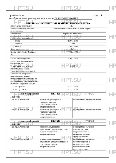 Оборудование ТС страховочные цепи; противооткатные упоры; страховочные тросы по заказу: одна боковая дверь в передней части; две боковые двери в передней части; одно боковое окно; два боковых окна; поручень; система хранения амуниции; приспособления для привязи животных, включая систему "антипаника"; кормушка для животных; внутренне освещение; внутренне видеонаблюдение; тент; откидной пластиковый элемент; откидная металлическая решетка