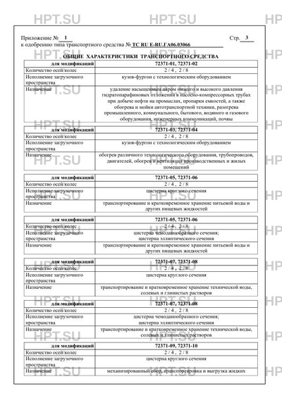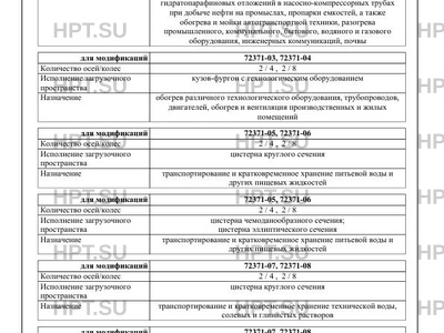 Оборудование ТС для 72371-13, 72371-14: увязочные устройства по заказу: противооткатные упоры; опорные устройства; запасное колесо; проблесковый маяк оранжевого цвета; инструментальный ящик; для 72371-01, 72371-02: окно боковое; окно в торцевой стенке; боковая дверь; задние двери; для 72371-03, 72371-04: передние двери; для 72371-05, 72371-06, 72371-07, 72371-08: устройство выдачи жидкости; напорно-всасывающие рукава; насос с гидравлическим приводом; счетчик жидкости; для 72371-09, 72371- 10: напорно-всасывающие рукава; для 72371-11, 72371-12: настил; борта; стойки; выдвижные стойки; контейнерные замки; лебедка подъема запасного колеса; стойки для фиксации груза; приспособления для увязки груза (петли); каркас тента; тент; задние распашные ворота; для 72371-13, 72371-14: настил; переднее ограждение; для 72371-15, 72371-16: боковое окно; боковые окна; заднее окно; переднее окно; боковая дверь; задняя дверь; задние двери; бак для воды; ремонтное оборудование; для 72371-17, 72371- 18: задняя дверь; задние двери; боковая дверь; боковые двери; для 72371-19, 72371-20: задние распашные ворота; тент
