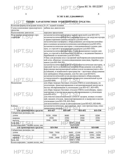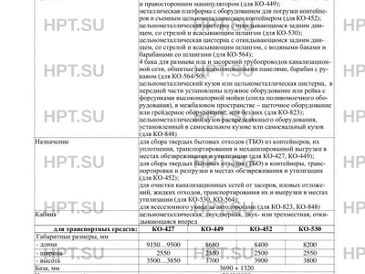 | Исполнение загрузочного пространства | цельнометаллический кузов с задней загрузкой (для КО-427); цельнометаллический кузов с верхним люком для загрузки мусора и правосторонним манипулятором (для КО-449); металлическая платформа с оборудованием для погрузки контейнеров и съемным цельнометаллическим контейнером (для КО-452); цельнометаллическая цистерна с откидывающимся задним днищем, со стрелой и всасывающим шлангом (для КО-530); цельнометаллическая цистерна с откидывающимся задним днищем, со стрелой и всасывающим шлангом, с водяными баками и барабанами со шлангами (для КО-564); 4 бака для размыва ила и засорений трубопроводов канализационной сети, обшитые теплоизоляционными панелями, барабан с рукавом (для КО-564-50); цельнометаллический кузов или цельнометаллическая цистерна, в передней части установлены плужное оборудование или рейка с форсунками высоконапорной мойки (сопла поливомоечного оборудования), в межбазовом пространстве - щеточное оборудование или грейдерное оборудование, или без них (для КО-823); цельнометаллический кузов распределяющего оборудования, установленный в самосвальном кузове или самосвальный кузов (для КО-848) |