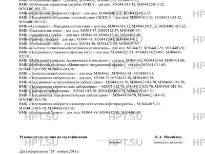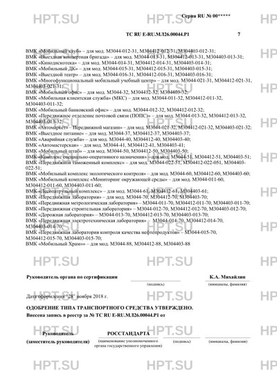 | Дополнительная информация | Транспортные средства типа М3044 изготовлены на базовых транспортных средствах ПАЗ типа 3204, модификации 320402-04, 320402-05, 320402-14, 320405-04 (для мод. М3044…), типа 3204, модификации 320412-04, 320412-05, 320412-14, 320414-04, 320414-05, 320414-14 (для мод. М304412…) типа 3203, модификация 320302-08, 320302-02, 320302-12, 320302-22 (для мод. М304403…) Экологический класс транспортных средств: 4 – для мод. с двигателем ЗМЗ 52342.10, 5245.1000400, 5245.1000400-10, 5245.1000400-20; 5 – для мод. с двигателем ЯМЗ 53423, 53414, 53424, Cummins ISF 3.8s5168. Данное Одобрение типа транспортного средства является распространением Одобрения типа транспортного средства № ТС RU Е-RU.МТ22.00644. Транспортные средства типа М3044 могут осуществлять буксировку прицепа только имеющего тормоз наката. Коммерческое наименование: ВМК «Медицинский кабинет» («Медкабинет») – для мод. М3044, М304412, М304403; ВМК «Медицинский кабинет – Мобильная эндоскопия» – для мод.М3044-011, М304412-011; ВМК «Медицинский кабинет – Мобильный гемодиализ» – для мод. М3044-012, М304412-012; ВМК «Медицинский процедурный кабинет» – для мод. М3044-014, М304412-014, М304403-014; ВМК «Медицинский кабинет – Гериатрическая помощь» – для мод. М304412-015; ВМК «Медицинский кабинет – Мобильный Центр Здоровья» («Мобильный Центр Здоровья») – для мод. М3044-020, М3044-021, М3044-022, М304412-020, М304412-021, М304412-022; ВМК «Медицинский кабинет (Социальная помощь)» – для мод. М3044-040, М304412-040, М304403-040; ВМК «Медицинский кабинет – Мобильная поликлиника» – для мод. М3044-050, М304412-050, М304403-050; ВМК «Лучевая диагностика – Передвижной флюорограф» – для мод. М3044-01, М3044-011-01, М304412-01, М304412-011-01, М304403-01; ВМК «Лучевая диагностика – Выездной медосмотр» – для мод. М3044-020-01, М3044-021-01, М304412-020-01, М304412-021-01; ВМК «Лучевая диагностика – Профилактика заболеваний социального характера» – для мод. М304412-022-01; ВМК «Лучевая диагностика – Флюмамм» – для мод. М304412-023-01; ВМК «Выездной медосмотр – Флюмамм» – для мод. М304412-024-01; ВМК «Лучевая диагностика – Рентгенодиагностический кабинет» – для мод. М304412-030-01; ВМК «Лучевая диагностика – Рентгенографический кабинет» – для мод. М304412-031-01; ВМК «Женское здоровье» (Передвижной маммограф) («Женское здоровье») – для мод. М3044-02, М304412-02; ВМК «Лаборатория и диагностика» – для мод. М3044-03, М304412-03; ВМК «Стоматологическая помощь» – для мод. М3044-04, М304412-04, М304403-04; ВМК «Передвижной лабораторный комплекс» – для мод. М3044-05, М304412-05, М304403-05; ПЛК «Клинико-диагностическая лаборатория» – для мод. М3044-010-05, М304412-010-05, М304403-010-05; ПЛК «ПЦР-лаборатория» – для мод. М304412-011-05; ПЛК «ИФА-лаборатория» – для мод. М3044-012-05, М304412-012-05; ПЛК «Бактериологическая лаборатория» – для мод. М3044-013-05, М304412-013-05; ПЛК «Передвижная наркологическая лаборатория» – для мод. М3044-020-05, М304403-020-05; ПЛК «Паразитологическая лаборатория» – для мод. М3044-114-05, М304412-114-05; ПЛК «Экспертиза качества пищевых продуктов» – для мод. М3044-115-05, М304412-115-05; ПЛК «Мониторинг окружающей среды» – для мод. М3044-116-05, М304412-116-05, М304403-116-05; ПЛК «Радиологическая лаборатория» – для мод. М3044-117-05, М304403-117-05; ПЛК «Токсикологическая лаборатория» – для мод. М3044-118-05, М304412-118-05; ПЛК «Измерение физических факторов» – для мод. М3044-119-05, М304403-119-05; ПЛК «Лаборатория ветеринарного надзора – Клинико-диагностическая» – для мод. М3044-210-05, М304412-210-05; ПЛК «Лаборатория ветеринарного надзора – ПЦР-лаборатория» – для мод. М304412-211-05; ПЛК «Лаборатория ветеринарного надзора – ИФА-лаборатория» – для мод. М3044-212-05, М304412-212-05; ПЛК «Лаборатория ветеринарного надзора – Бактериологическая» 