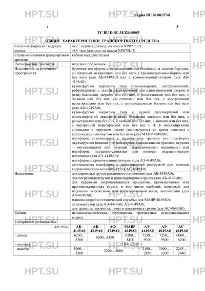 | Оборудование ТС | устройство вызова экстренных оперативных служб; тент, каркас тента, ворота (для АБ-4349А0); внутреннее освещение кузова, ступенька и поручень, фиксирующие элементы для удержания груза (для АФ-4749В0, МАВР-4849А0); холодильное оборудование (хладагент R134A) (для АФ-4749А0); два противооткатных устройства и две проушины для крепления эвакуируемого автомобиля, проблесковый маячок оранжевого цвета, фара освещения рабочей зоны (для АЭ-4449А0, АЭ-4049А0); электроагрегат дизельный, штырь заземления, сварочное оборудование, набор слесарного инструмента, автономный отопитель Webasto Air Top Evo (в фургонах с пассажирскими сиденьями), комплект встроенной мебели фирмы Modul System (для МАВР-4849А0); тент, упор (для АС-4649А0); по заказу: спойлер на крыше кабины, стабилизатор поперечной устойчивости (для мод. на шасси NPR??L-?) |
