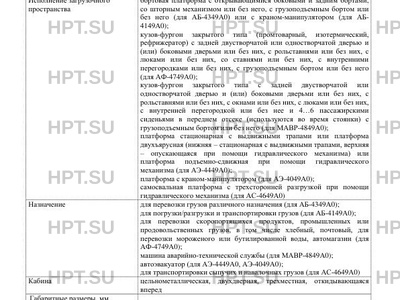 | Исполнение загрузочного пространства | бортовая платформа с открывающимися боковыми и задним бортами, со шторным механизмом или без него, с грузоподъемным бортом или без него (для АБ-4349А0) или с краном-манипулятором (для АБ- 4149А0); кузов-фургон закрытого типа (промтоварный, изотермический, рефрижератор) с задней двустворчатой или одностворчатой дверью и (или) боковыми дверьми или без них, с рольставнями или без них, с люками или без них, со ставнями или без них, с внутренними перегородками или без них, с грузоподъемным бортом или без него (для АФ-4749А0); кузов-фургон закрытого типа с задней двустворчатой или одностворчатой дверью и (или) боковыми дверьми или без них, с рольставнями или без них, с окнами или без них, с люками или без них, с внутренней перегородкой или без нее и 4…6 пассажирскими сиденьями в переднем отсеке (используются во время стоянки) с грузоподъемным бортом или без него (для МАВР-4849А0); платформа стационарная с выдвижными трапами или платформа двухъярусная (нижняя - стационарная с выдвижными трапами, верхняя - опускающаяся при помощи гидравлического механизма) или платформа подъемно-сдвижная при помощи гидравлического механизма (для АЭ-4449А0); платформа с краном-манипулятором (для АЭ-4049А0); самосвальная платформа с трехсторонней разгрузкой при помощи гидравлического механизма (для АС-4649А0) |