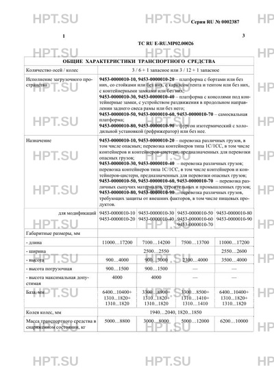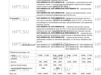 | Назначение | 9453-0000010-10, 9453-0000010-20 - перевозка различных грузов, в том числе опасных; перевозка контейнеров типа 1С/1СС, в том числе контейнеров и контейнеров-цистерн, предназначенных для перевозки опасных грузов; 9453-0000010-30, 9453-0000010-40 - перевозка различных грузов; перевозка контейнеров типа 1С/1СС, в том числе контейнеров и контейнеров-цистерн, предназначенных для перевозки опасных грузов; 9453-0000010-50, 9453-0000010-60, 9453-0000010-70 - перевозка различных сыпучих материалов, строительных и промышленных грузов; 9453-0000010-80, 9453-0000010-90 - перевозка различных грузов, требующих защиты от внешних факторов, в том числе пищевых продуктов. |