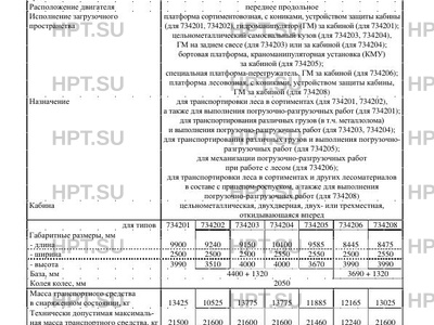 | Тип ТС | Коммерческое наименование автомобиль-сортиментовоз с ГМ используется для транспортных средств типа 734201; автомобиль-сортиментовоз - для 734202; автомобиль-металловоз с ГМ - для 734203, 734204; автомобиль бортовой с КМУ - для 734205; автомобиль специальный для погрузки леса - для 734206; автомобиль-тягач лесовозный с ГМ - для 734208. Для изготовления транспортных средств применяются модификации шасси 43118-42, 43118-46, 43118-L4. |