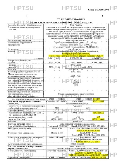 | Дополнительная информация | Коммерческое наименование машина вакуумная подметальная используется для транспортных средств типа МВП G20.01; машина комбинированная дорожная — для КДМ G20.01, КДМ G20.02. Для изготовления транспортных средств применяются модификации шасси C41R13, C41R33, C41R11, C41R31, C42R33. |