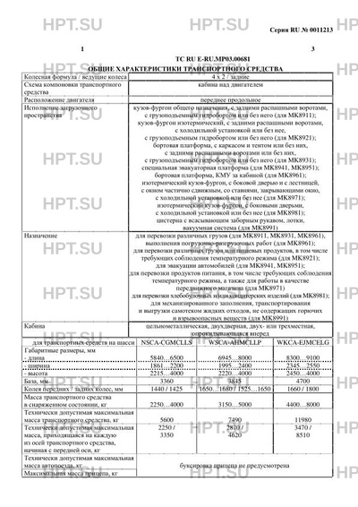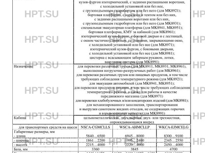 | Дополнительная информация | Транспортные средства не предназначены для перевозки опасных грузов. Коммерческое наименование автомобиль-фургон промтоварный используется для транспортных средств типа MK8911; автомобиль-фургон изотермический, рефрижератор — для MK8921; автомобиль грузовой — для MK8931; автомобиль-эвакуатор — для MK8941, MK8951; автомобиль бортовой c КМУ — для MK8961; автолавка — для MK8971; автомобиль фургон хлебный — для MK8981; вакуумная машина — для MK8991. Для изготовления транспортных средств применяются модификации шасси: NSCA-CGMCLLS с коммерческим наименованием N56, WSCA-AHMCLLP с коммерческим наименованием N75, WKCA-EJMCELG с коммерческим наименованием N120. Использована аббревиатура КМУ — краноманипуляторная установка. |