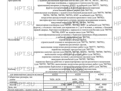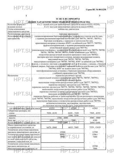 | Дополнительная информация | Транспортные средства не предназначены для перевозки опасных грузов. Коммерческое наименование автомобиль бортовой специализированный используются для транспортных средств типов 780776, 780787, 780791; автомобиль бортовой с КМУ — для 780777, 780792; автомобиль-фургон изотермический — для 780778; автомобиль-самосвал — для 780779, 780780, 780788, 780789, 780793; автомобиль-самосвал с КМУ — для 780781; автомобиль-мультилифт — для 780782; автомобиль вакуумный МВ-5 — для 780783, 780790; автомобиль вакуумный МВ-8 — для 780784; автомобиль-эвакуатор с ломаной платформой — для 780785; автомобиль-эвакуатор с прямой платформой с КМУ — для 780786; автомобиль грузопассажирский ГПА — для 780795; автомобиль грузопассажирский ГПА с КМУ — для 780796; автомобиль-установка бурильно-крановая БКУ — для 780794. Для изготовления транспортных средств типов 780776, 780777, 780778, 780779, 780780, 780781, 780782, 780783, 780784, 780785, 780786 применяется модификация шасси 43253-G5; для 780787, 780788, 780789, 780790 — 43255-G5; для 780791, 780792, 780793, 780794, 780795, 780796 — 43502-D5. Показатели масс не могут превышать максимальных для конкретного шасси, указанных в одобрении типа шасси, на табличке изготовителя шасси и в его сопроводительной документации. |