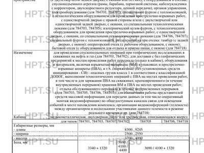 | Тип ТС | Коммерческое наименование подъемник каротажный самоходный ПКС 5-03 используется для транспортных средств типа 784701; подъемник каротажный самоходный ПКС 5-04 – для 784702; лаборатория перфораторной станции ЛПС 7-02 – для 784703; лаборатория перфораторной станции ЛПС 7-03 – для 784705; лаборатория геофизическая самоходная ЛГС – для 784706, 784707; мобильный комплекс информирования и оповещения населения МКИОН – для 784718. Для изготовления транспортных средств типов 784701, 784703, 784707 применяются модификации шасси 5350-D5, для 784702, 784705, 784706, 784718 – 43118-50, 43118-А5, 43118-RR, 43118RS. Транспортные средства типа 784703, 784705, 784706, 784707 относятся к транспортным средствам ЕХ/II в соответствии с пунктом 9.1.1.2 Европейского соглашения о международной дорожной перевозке опасных грузов (ДОПОГ). Показатели масс не могут превышать максимальных для конкретного шасси, указанных в одобрении типа шасси, на табличке изготовителя шасси и в его сопроводительной документации. |