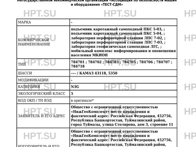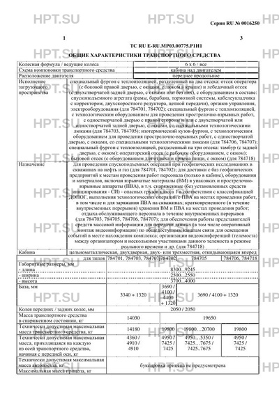 | Дополнительная информация | Коммерческое наименование подъемник каротажный самоходный ПКС 5-03 используется для транспортных средств типа 784701; подъемник каротажный самоходный ПКС 5-04 – для 784702; лаборатория перфораторной станции ЛПС 7-02 – для 784703; лаборатория перфораторной станции ЛПС 7-03 – для 784705; лаборатория геофизическая самоходная ЛГС – для 784706, 784707; мобильный комплекс информирования и оповещения населения МКИОН – для 784718. Для изготовления транспортных средств типов 784701, 784703, 784707 применяются модификации шасси 5350-D5, для 784702, 784705, 784706, 784718 – 43118-50, 43118-А5, 43118-RR, 43118RS. Транспортные средства типа 784703, 784705, 784706, 784707 относятся к транспортным средствам ЕХ/II в соответствии с пунктом 9.1.1.2 Европейского соглашения о международной дорожной перевозке опасных грузов (ДОПОГ). Показатели масс не могут превышать максимальных для конкретного шасси, указанных в одобрении типа шасси, на табличке изготовителя шасси и в его сопроводительной документации. |