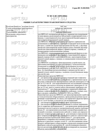 | Оборудование ТС | устройство ограничения максимальной скорости (функцию устройства ограничения максимальной скорости выполняет электронный блок управления двигателем), дневные ходовые огни; - технологическое оборудование для проведения различных исследований и мероприятий, выполнения ремонтных, восстановительных и аварийных работ (для MPZ1A4, MPZ2A4, MPZ9A4, MPZNA4); - технологическое оборудование для проведения прострелочновзрывных работ, решетки на окнах, защита топливных баков и аккумуляторных батарей, бесшовные кабелепроводы защиты электропроводки, заземлительная цепочка и металлический штырь для защиты от статических и атмосферных электрических зарядов, аппаратура спутниковой навигации, два проблесковых маячка автожелтого цвета (для MPZ4A4); - сигнально-громкоговорящая установка, один или два проблексковых маячка синего цвета, фары искатели (для MPZNA4 мод. G, J); по заказу: предпусковой подогреватель двигателя, лебедка, кондиционер, отопительно-вентиляционная установка, устройство вызова экстренных оперативных служб с функцией автоматического срабатывания при опрокидывании или без нее; ящик для перевозки источников ионизирующего излучения (для MPZ4A4) |