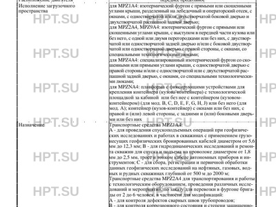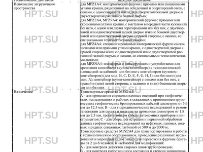 | Назначение | Транспортные средства MPZ1A4: A - для проведения спускоподъемных операций при геофизических исследованиях и работах в скважинах с применением грузонесущих геофизических бронированных кабелей диаметром от 5,6 мм до 12,3 мм; B - для гидродинамических исследований и ремонта скважин для спуска и подъема на проволоке диаметром от 1,8 мм до 2,5 мм, тросе и тонком кабеле автономных приборов и инструментов; C - для сбора, регистрации и первичной обработки данных геофизических исследований на нефтяных, газовых, водных и рудных скважинах глубиной от 500 м до 2000 м J - для ремонта и профилактических работ на линиях связи, контактных и силовых электросетях, на нефтяных, газовых, тепловых, водопроводных и канализационных магистралях; K - для проведения испытаний, поверки, калибровки, аттестации и мелкого ремонта приборов и средств технологического контроля службой метрологического контроля; L - для проведения периодического приборного обследования подземных газопроводов; M - для проведения аварийноремонтных и восстановительных работ на магистральных нефтеи газопроводах и коммунальных сетях; N - для выполнения текущего и аварийного ремонта подземных и наземных нефтегазопроводов различного диаметра и назначения; P - для выполнения электрогазосварочных и слесарно-монтажных работ на магистральных и промысловых трубопроводах и других объектах; R - для проведения аварийноремонтных работ в отрыве от стационарных источников питания электроэнергией; S - для выполнения ремонтных и профилактических работ в коммунальном хозяйстве, теплосетях; T- для аварийноспасательных и ремонтно-восстановительных работ на линиях связи, контактных и силовых электросетях, на нефтяных, газовых, тепловых, водопроводных и канализационных магистралях; U - для технического обслуживания и ремонта автомобилей специального назначения в отрыве от ремонтных баз и стационарных источников электроснабжения, а также в составе подвижных ремонтных комплексов; V - для выполнения разборочно-сборочных, слесарно-подгоночных работ автомобилей специального назначения при ремонте в полевых условиях; W - для аварийно-восстановительных и ремонтных работ на газопроводах. J - для обеспечения связью мобильных абонентов сети сотовой связи; K - для организации выездных культурно-массовых мероприятий, транспортировки и хранения специального и сценического оборудования; L - для обслуживания и ремонта подземных газопроводов; M - для организации устойчивой подвижной радиотелефонной связи в районах отсутствия или слабого радиопокрытия сети; N - для работы и отдыха оперативного состава; P - для работы, обеспечения связи и отдыха оперативного состава; R - для аварийных и ремонтновосстановительных работ, в том числе обслуживания оборудования электрических сетей, на магистральных нефтеи газопроводах, обеспечения выполнения аварийных и других неотложных работ в ходе ликвидаций последствий аварий в сложных природно-климатических условиях эксплуатации; S - для комплексного сервисного обслуживания электротехнического оборудования на объектах нефтегазовой отрасли, а также на всех объектах народного хозяйства; T - для аварийного и профилактического ремонта наземного оборудования, арматуры и трубопроводов; U - для перевозки бригады рабочих и транспортировки грузов различного назначения; V- д