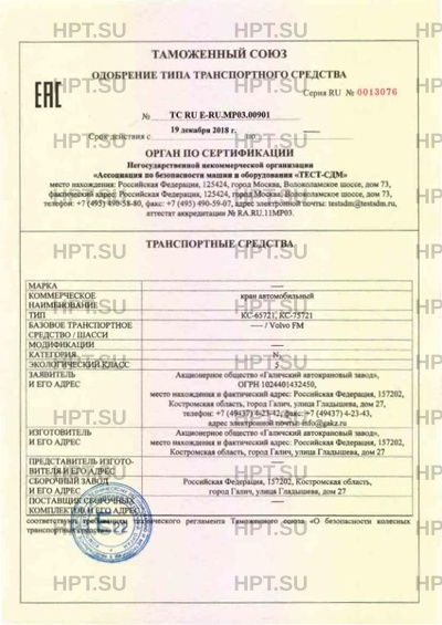 | Заявитель | Акционерное общество "Галичский автокрановый завод". место нахождения и фактический адрес: Российская Федерация, 157202, Костромская область, город Галич, улица Гладышева, дом 27. ОГРН: 1024401432450. Тел. +7 (49437) 4-23-42. Факс +7 (49437) 4-23-43. Email info@gakz.ru. |