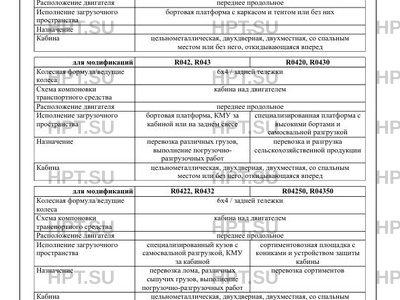| Дополнительная информация | Транспортные средства не предназначены для перевозки опасных грузов. Коммерческое наименование автомобиль грузовой используется для транспортных средств типа R04 модификаций 795761, 795762, 795763; кран-манипулятор автомобильный – для R042, R043, R044; ломовоз (металловоз) – для R0422, R0432, R0442; зерновоз – для R0420, R0430, R0440; мусоровоз – для R0433, R0443; сортиментовоз – для R04250, R04350, R04450; сортиментовоз с КМУ – для R04251, R04351, R04451; самосвал – для R04260, R04360, R04460; самосвал с КМУ – для R04261, R04361, R04461; автогидроподъемник – для R0428, R0438, R0448; автомобиль-крюковой погрузчик (мультилифт) – для R0429, R0439, R0449. Для изготовления транспортных средств типа R04 модификаций 795762, R043, R0430, R0432, R0433, R04350, R04351, R04360, R04361, R0438, R0439 применяются модификации шасси 65207-S5, 65207-T5; для 795763, R044, R0440, R0442, R0443, R04450, R04451, R04460, R04461, R0448, R0449 – 65208-S5; для 795761, R042, R0420, R0422, R0428, R0429, R04250, R04251, R04260, R04261 – 6580-S5, 6580-T5. Показатели масс не могут превышать максимальных для конкретного шасси, указанных в одобрении типа шасси, на табличке изготовителя шасси и в его сопроводительной документации. В случае фактического превышения транспортным средством весовых ограничений, установленных пунктами 2.1 и 2.2 приложения № 5 к техническому регламенту Таможенного союза «О безопасности колесных транспортных средств», для его передвижения по территории Евразийского экономического союза необходимо оформление специального разрешения. Использована аббревиатура КМУ — краноманипуляторная установка. |