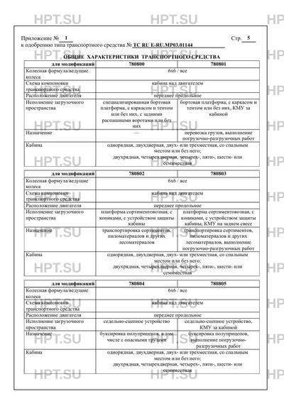 | Тип ТС | Коммерческое наименование автомобиль бортовой специализированный используется для транспортных средств типа FKN343118 модификации 780800, автомобиль бортовой с КМУ - для 780801, 780823, автомобиль-сортиментовоз - для 780802, автомобиль-сортиментовоз с КМУ - для 780803, автомобиль-тягач седельный - для 780804, автомобиль-тягач седельный с КМУ - для 780805, автомобиль-тягач лесовозный - для 780806, автомобиль-тягач лесовозный с КМУ - для 780807, автомобиль-самосвал - для 780808, автомобиль-самосвал с КМУ - для 780809, автомобиль-агрегат ремонта и технического обслуживания станков-качалок АРОК с КМУ - для 780810, автомобиль-агрегат для сбора газового конденсата и нефти АКН - для 780811, автомобиль-агрегат цементировочный АЦ-32 - для 780812, автомобиль-фургон - для 780813, автомобиль-установка паровая передвижная ППУА-1600/100 - для 780814, автомобиль-установка бурильно-крановая БКУ - для 780815, автомобиль-мультилифт - для 780816, автомобиль-контейнеровоз - для 780817, автомобиль вакуумный АВ - для 780818, автомобиль-топливозаправщик АТЗ - для 780819, автомобиль-цистерна для питьевой воды АЦПТ - для 780820, автомобиль-цистерна для технической воды АЦВ - для 780821, автомобиль-цистерна АЦ - для 780822. Для изготовления транспортных средств применяются модификации шасси 43118-50, 43118-А5, 43118-RR, 43118-RS. Транспортные средства типа FKN343118 модификаций 780811, 780819, 780822 относятся к транспортным средствам FL в соответствии с пунктом 9.1.1.2 Европейского соглашения о международной дорожной перевозке опасных грузов (ДОПОГ), типа FKN343118 модификации 780804 в исполнении для буксировки полуприцепов с опасными грузами относятся к транспортным средствам EX/ІІ, EX/ІІІ, FL, AT. Показатели масс не могут превышать максимальных для конкретного шасси, указанных в одобрении типа шасси, на табличке изготовителя шасси и в его сопроводительной документации. Транспортные средства типа FKN343118 модификации 780810 не могут изготавливаться в исполнении с двухрядной кабиной. Тип FKN343118 имеет условное обозначение 780800, 780801, 780802, 780803, 780804, 780805, 780806, 780807, 780808, 780809, 780810, 780811, 780812, 780813, 780814, 780815, 780816, 780817, 780818, 780819, 780820, 780821, 780822, 780823 |