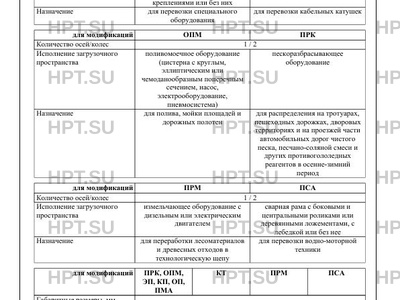 | Исполнение загрузочного пространства | платформа с настилом или бортовая платформа, с тентом или защитным кожухом, с креплениями или без них сварная рама с элементами и устройствами крепления груза поливомоечное оборудование (цистерна с круглым, эллиптическим или чемоданообразным поперечным сечением, насос, электрооборудование, пневмосистема) пескоразбрасывающее оборудование измельчающее оборудование с дизельным или электрическим двигателем сварная рама с боковыми и центральными роликами или деревянными ложементами, с лебедкой или без нее |