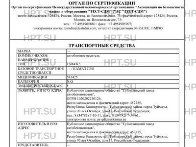 | Заявитель | Публичное акционерное общество "Туймазинский завод автобетоновозов", ОГРН 1020202210126, место нахождения и фактический адрес: 452755, Республика Башкортостан, Туймазинский район, город Туймазы, улица 70 лет Октября, дом 17, Российская Федерация, тел.: 8 (34782) 7-10-11, факс: 8 (34782) 7-34-61, электронная почта: pr-gdtza@kamaz.ru |