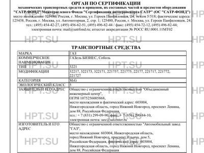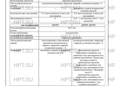 | Оборудование ТС | утеплитель облицовки радиатора; устройство вызова экстренных оперативных служб с ручным включением и автоматическим срабатыванием при опрокидывании; для мод. 322171: устройство ограничения максимальной скорости (функцию устройства ограничения максимальной скорости выполняет электронный блок управления двигателем); для мод. 221757, 221775: светосигнальная громкоговорящая установка; для автомобилей скорой медицинской помощи: светосигнальная громкоговорящая установка, противотуманные фары и медицинское оборудование по заказу: клееные стекла салона; детермальные стекла; сдвижная дверь с механическим приводом (электроприводом); cовмещенная система вентиляции, отопления и кондиционирования (система управления климатом) с ручным управлением; догреватель охлаждающей жидкости; предпусковой подогреватель; противотуманные фары; центральный замок передних дверей; наружные зеркала заднего вида с электроприводом, с электрообогревом; электрические стеклоподъемники; круизконтроль; панель приборов люкс; магнитола; АКБ повышенной емкости; блокировка дифференциала заднего моста; дневные ходовые огни; тахограф; для мод. 221757, 221775: вытяжка с электрическим управлением; для мод. 221757, 221775 дополнительный отопитель; для мод. 221757, 221775 в соответствии с требованиями заказчика; для мод. 322171: специальный предупреждающий огонь желтого или оранжевого цвета (один или два) |