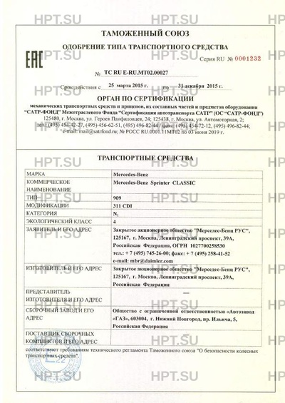 | Коммерческое наименование | Mercedes-Benz Sprinter СLASSIC |