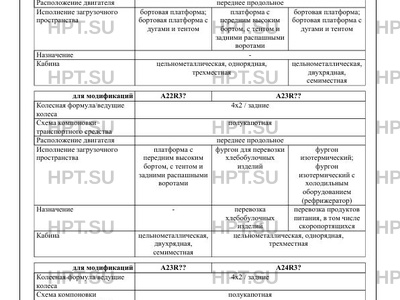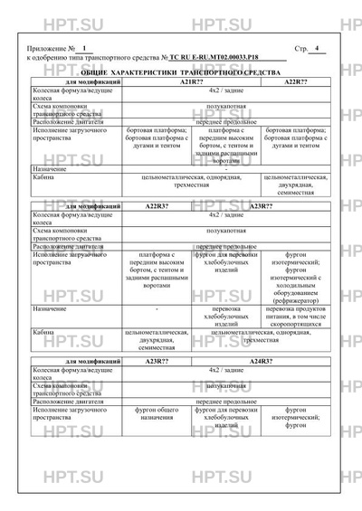 | Тип ТС | Допускается наличие на транспортном средстве дополнительной маркировки, помимо приведенной в Приложении № 3 к настоящему одобрению типа транспортного средства, идентификационным номером (VIN) используемого базового транспортного средства (шасси) собственного производства. Модификации A23R??, A24R?? (для перевозки хлебобулочных изделий, продуктов питания, в том числе скоропортящихся) относятся к специализированным транспортным средствам. Характеристики двигателей УМЗ А2755, А3055, указанные в Приложении № 1, приведены при работе на бензине. При работе двигателя УМЗ А2755 на сжиженном нефтяном газе: - максимальная мощность по Правилам ООН № 85-00: 76.7 кВт при 4000 об/мин; - максимальный крутящий момент: 219 Нм при 2350±150 об/мин; При работе двигателя УМЗ А3055 на компримированном природном газе: - максимальная мощность по Правилам ООН № 85-00: 78.5 кВт при 4000 об/мин; - максимальный крутящий момент: 220 Нм при 2350±150 об/мин |