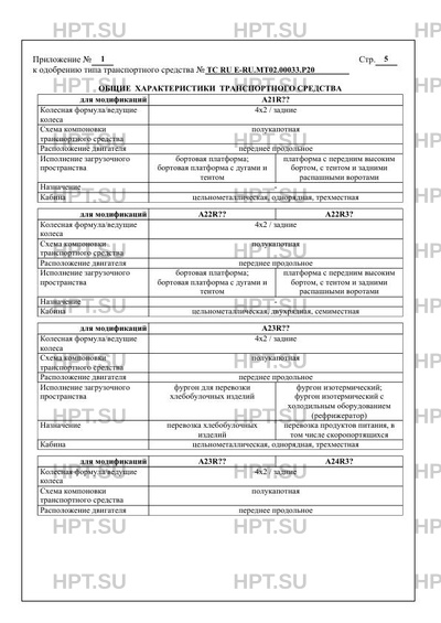 | Тип ТС | Допускается наличие на транспортном средстве дополнительной маркировки, помимо приведенной в Приложении № 3 к настоящему одобрению типа транспортного средства, идентификационным номером (VIN) используемого базового транспортного средства (шасси) собственного производства. Транспортные средства для перевозки хлебобулочных изделий и продуктов питания, в том числе скоропортящихся (модификаций A23R??, A24R??), относятся к специализированным транспортным средствам. Автомобили скорой медицинской помощи (модификаций A3AR2?, A3BR2?, A3CR2?) относятся к специальным транспортным средствам. Характеристики двигателей УМЗ А2755, А3055, указанные в приложении № 1, приведены при работе на бензине. При работе двигателя УМЗ А2755 на сжиженном нефтяном газе: - максимальная мощность по Правилам ООН № 85-00: 76.7 кВт при 4000 об/мин; - максимальный крутящий момент: 219 Нм при 2350±150 об/мин; При работе двигателя УМЗ А3055 (КПГ) на компримированном природном газе: - максимальная мощность по Правилам ООН № 85-00: 78.5 кВт при 4000 об/мин; - максимальный крутящий момент: 220 Нм при 2350±150 об/мин. При работе двигателя УМЗ А3055 (СНГ) на сжиженном нефтяном газе: - максимальная мощность по Правилам ООН № 85-00: 86.8 кВт при 4000 об/мин; - максимальный крутящий момент: 245 Нм при 2350±150 об/мин. Модификации А3AR2?, A3BR2?, A3CR2? относятся к автомобилям скорой медицинской помощи классов А, В, С соответственно, согласно п. 1.6 приложения № 6 к ТР ТС 018/2011. Для модификаций А3АR2?, A3BR2?, A3CR2? предусмотрена транспортировка пациентов на носилках в сопровождении медицинского персонала, а также проведение лечебных мероприятий в соответствии с классом автомобиля скорой медицинской помощи. Максимальная пассажировместимость: 4 пассажира + 1 на носилках или 3 пассажира + 2 на носилках или 3 пассажира + 1 на носилках или 2 пассажира + 2 на носилках. В отсеке для транспортировки пациентов допускается перевозка одного или двух пациентов на носилках и одного или двух сопровождающих. Данное ОДОБРЕНИЕ ТИПА ТРАНСПОРТНОГО СРЕДСТВА распространяется только на транспортные средства, соответствующие критериям, позволяющим отнести их к категории N1 в соответствии с примечанием 1 к Таблице 1 приложения № 1 к техническому регламенту Таможенного союза "О безопасности колесных транспортных средств". |