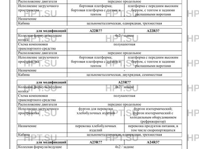 | Код VIN | используемого базового транспортного средства (шасси) собственного производства. Транспортные средства для перевозки хлебобулочных изделий и продуктов питания, в том числе скоропортящихся (модификаций A23R??, A24R??), относятся к специализированным транспортным средствам. Автомобили скорой медицинской помощи (модификаций A3AR2?, A3BR2?, A3CR2?) относятся к специальным транспортным средствам. Характеристики двигателей УМЗ А2755, А3055, указанные в приложении № 1, приведены при работе на бензине. При работе двигателя УМЗ А2755 на сжиженном нефтяном газе: - максимальная мощность по Правилам ООН № 85-00: 76.7 кВт при 4000 об/мин; - максимальный крутящий момент: 219 Нм при 2350±150 об/мин; При работе двигателя УМЗ А3055 (КПГ) на компримированном природном газе: - максимальная мощность по Правилам ООН № 85-00: 78.5 кВт при 4000 об/мин; - максимальный крутящий момент: 220 Нм при 2350±150 об/мин. При работе двигателя УМЗ А3055 (СНГ) на сжиженном нефтяном газе: - максимальная мощность по Правилам ООН № 85-00: 86.8 кВт при 4000 об/мин; - максимальный крутящий момент: 245 Нм при 2350±150 об/мин. Модификации А3AR2?, A3BR2?, A3CR2? относятся к автомобилям скорой медицинской помощи классов А, В, С соответственно, согласно п. 1.6 приложения № 6 к ТР ТС 018/2011. Для модификаций А3АR2?, A3BR2?, A3CR2? предусмотрена транспортировка пациентов на носилках в сопровождении медицинского персонала, а также проведение лечебных мероприятий в соответствии с классом автомобиля скорой медицинской помощи. Максимальная пассажировместимость: 4 пассажира + 1 на носилках или 3 пассажира + 2 на носилках или 3 пассажира + 1 на носилках или 2 пассажира + 2 на носилках. В отсеке для транспортировки пациентов допускается перевозка одного или двух пациентов на носилках и одного или двух сопровождающих. Данное ОДОБРЕНИЕ ТИПА ТРАНСПОРТНОГО СРЕДСТВА распространяется только на транспортные средства, соответствующие критериям, позволяющим отнести их к категории N1 в соответствии с примечанием 1 к Таблице 1 приложения № 1 к техническому регламенту Таможенного союза "О безопасности колесных транспортных средств". |