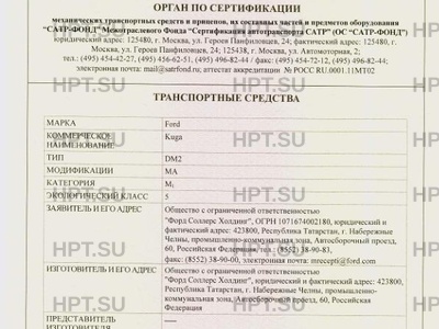 | Заявитель | Общество с ограниченной ответственностью "Форд Соллерс Холдинг" (ООО "Форд Соллерс Холдинг"). 423800, Республика Татарстан, г. Набережные Челны, промышленно-коммунальная зона, Автосборочный проезд, 60, Российская Федерация. ОГРН: 1071674002180. Тел. (8552) 38-90-83. Факс (8552) 38-90-00. Email mrecepti@ford.com. |